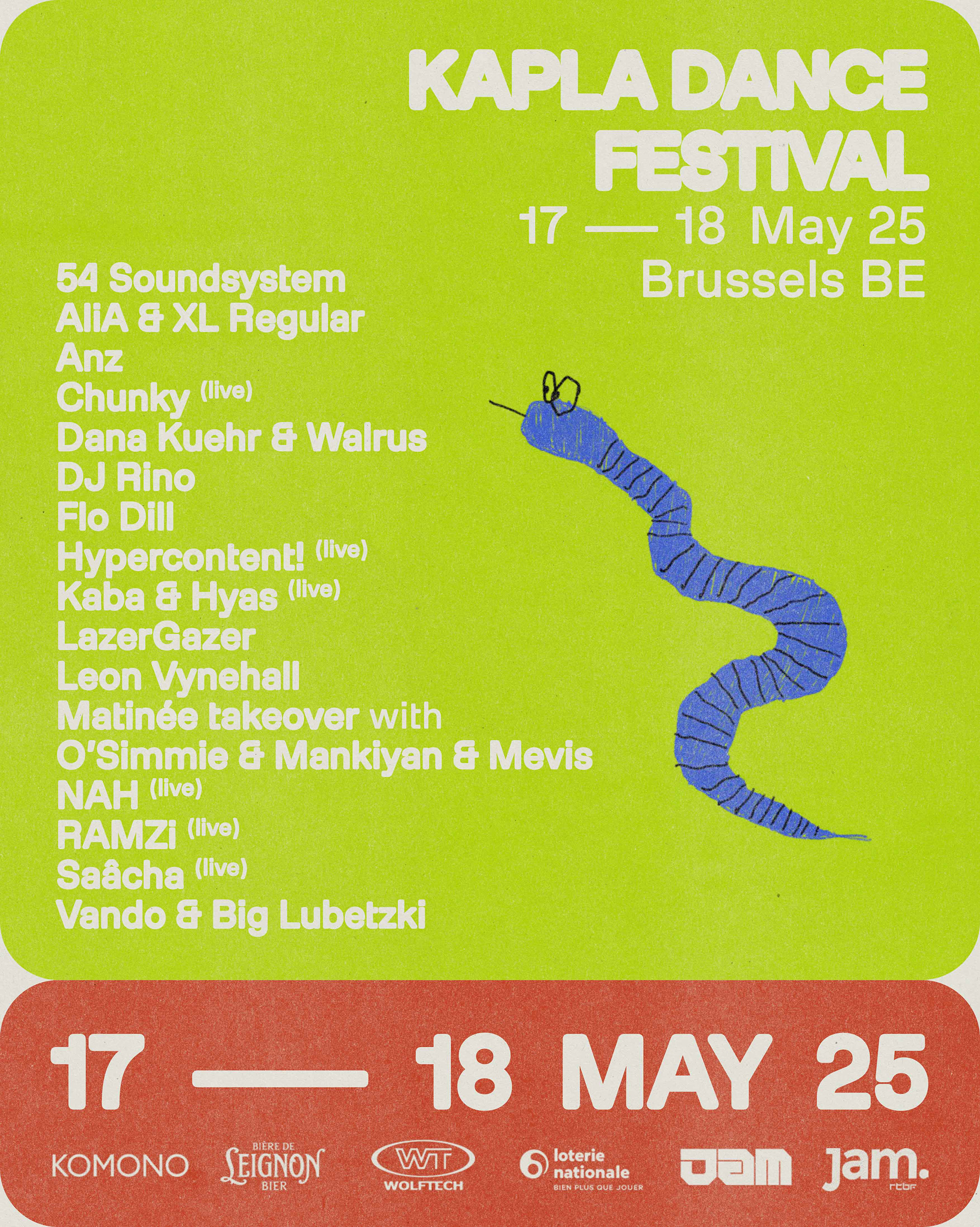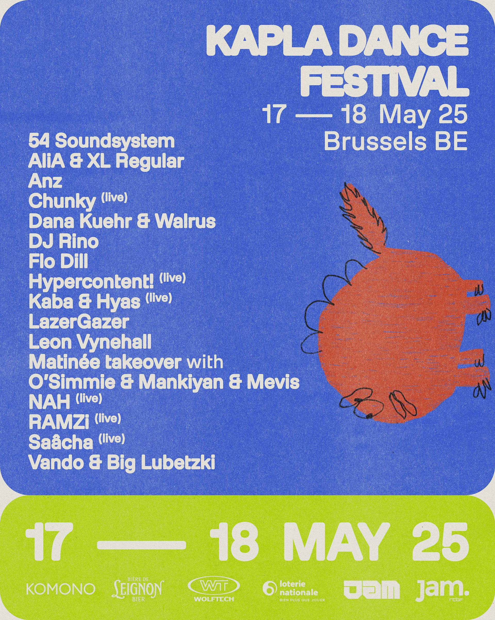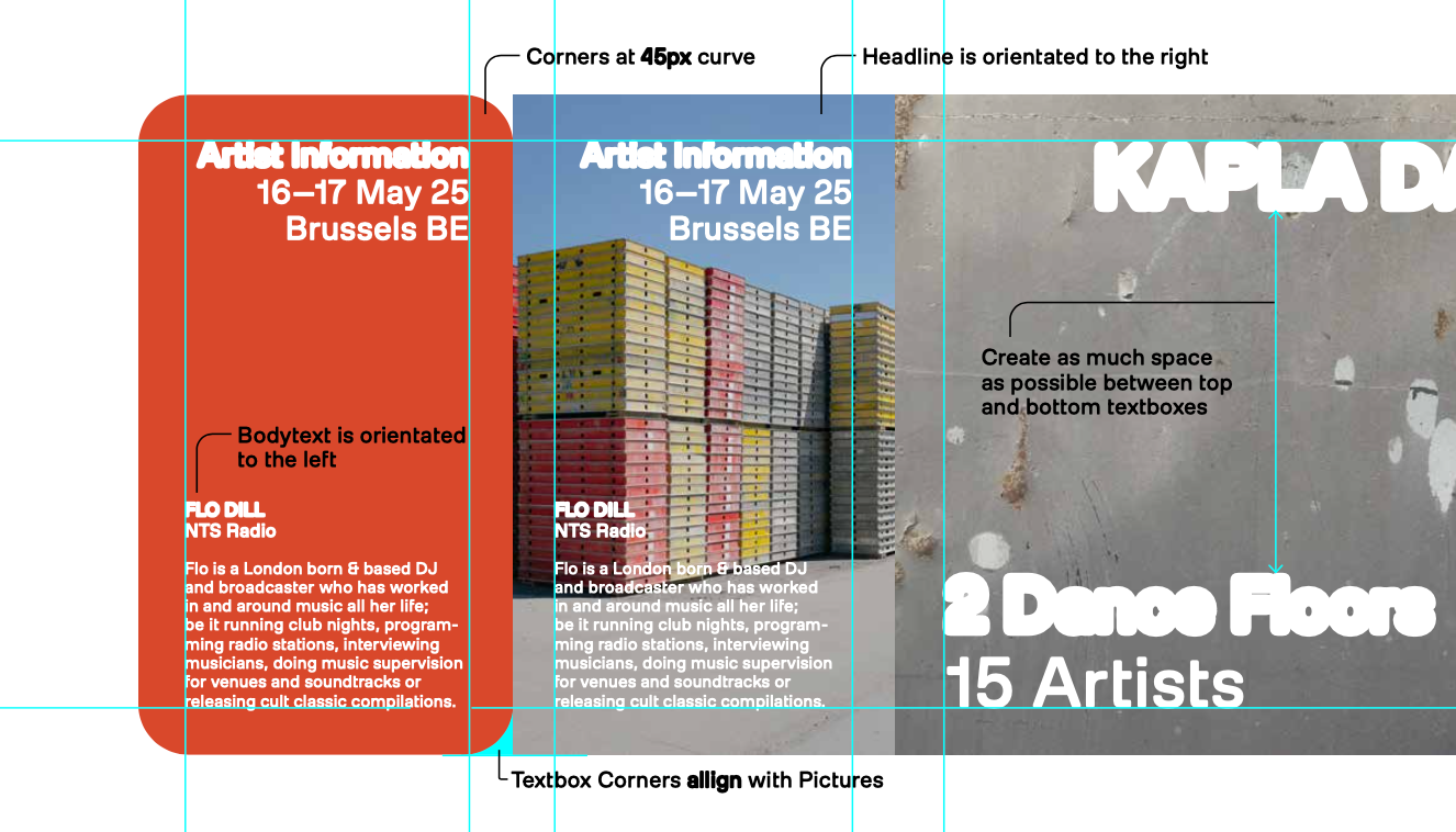 The visual concept is built around rounded color shapes that can be combined modularly to create images. Since the festival heavily focuses on the different venues of its events, photos of these locations become an integral part of the design. Close-ups of grassy fields or rocky surfaces are swapped out depending on the event, allowing each new event to stand out visually from the previous ones. This flexibility makes it possible to update the visuals each year and switch up the main colors, creating a fresh, unique vibe for every event and giving the impression of a one-of-a-kind experience. Together with the amazing team of Kapla Dance a multi sensory events where put together. Check it out!